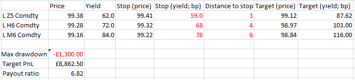I think that means there is an even better opportunity to sell short sterling now than three weeks ago. Below is a simple trade analysis (assuming 100k DV01) that sets a fairly arbitrary stop (arguable too close to the entry level, but if you really don’t believe the Bank will cut unless the world turns far worse, then the stop could almost be ignored. It is hear just to give some sense of the payout ratio should the Bank hike once in November this year, then again in May next year (ie a very gradual beginning to normalisation).