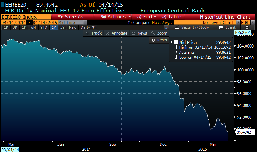 And the euro has chopped around a bit, but remains near the recent lows, with the effective exchange rate at the lows: