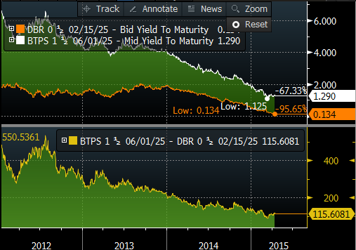 Govt bond yields have continued to fall across the EZ, with German 10y at a remarkable 0.13% and peripheral spreads (Italy in the chart below) still near their lows (despite worries about Grexit – aside: is there really enough contagion risk priced here??).