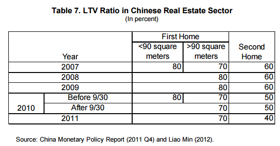 The first on the list is what I have just discussed. But the second – dynamic LTV requirements – has also been actively used by the PBOC. The table below shows the maximum loan-to-value allowable on first and second homes up to 2011. Ie there was a progressive tightening of these requirements through to 2011.