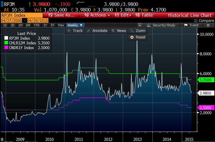 As ever, it is hard to trade China macro directly. I am not close enough to the regulatory changes that have impacted the local equity market. It has clearly soared, but I just don’t know enough about it to risk trading it. If the PBOC are going to be active on the monetary and macroprudential policy front, as they appear to be, then the need for the RMB to be used as an explicit policy easing tool is reduced. But that doesn’t mean the steady appreciation trend is likely to make a comeback. So as usual, I am left trying to figure out if the structural slowing in China growth is going to turn into a more serious cyclical slowdown that could even see a severe credit crunch and serious financial instability.