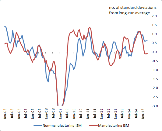 And more timely activity indicators, such as the ISM indices suggest that non-manufacturing remains robust, while manufacturing still struggles a bit.