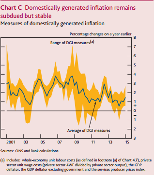 The second shows an estimate of domestically generated inflation. This is an attempt to measure the pace of ‘underlying’ inflation, and see if that reflects what you would expect given the view on slack. The average remains low, and while the Bank describe it as stable, you could argue that it has picked up a bit over the past year. It currently sits at 1.4%, somewhat above traditional core measures of CPI.