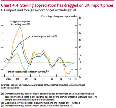 The first shows the impact of the exchange rate on import prices. It is significant, and therefore an important determinant of CPI inflation. What has been surprising though is the apparent reduced pass-through from the most recent appreciation. This has led the MPC to reduce the impact going forward as well. They have hedged this bet by maintaining the downside skew in inflation, but it is likely to be central to the debate over the coming months.
