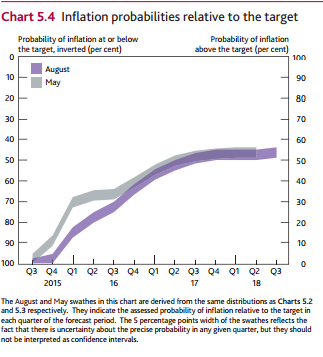 The chart below shows the inflation probabilities relative to target, with the overshoot in year 3.