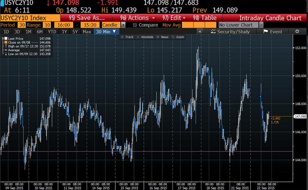 Interestingly US 2s10s (chart courtesy of @DavidTaggart on Twitter) is very little changed from pre-FOMC levels, after initially moving steeper and then flatter.